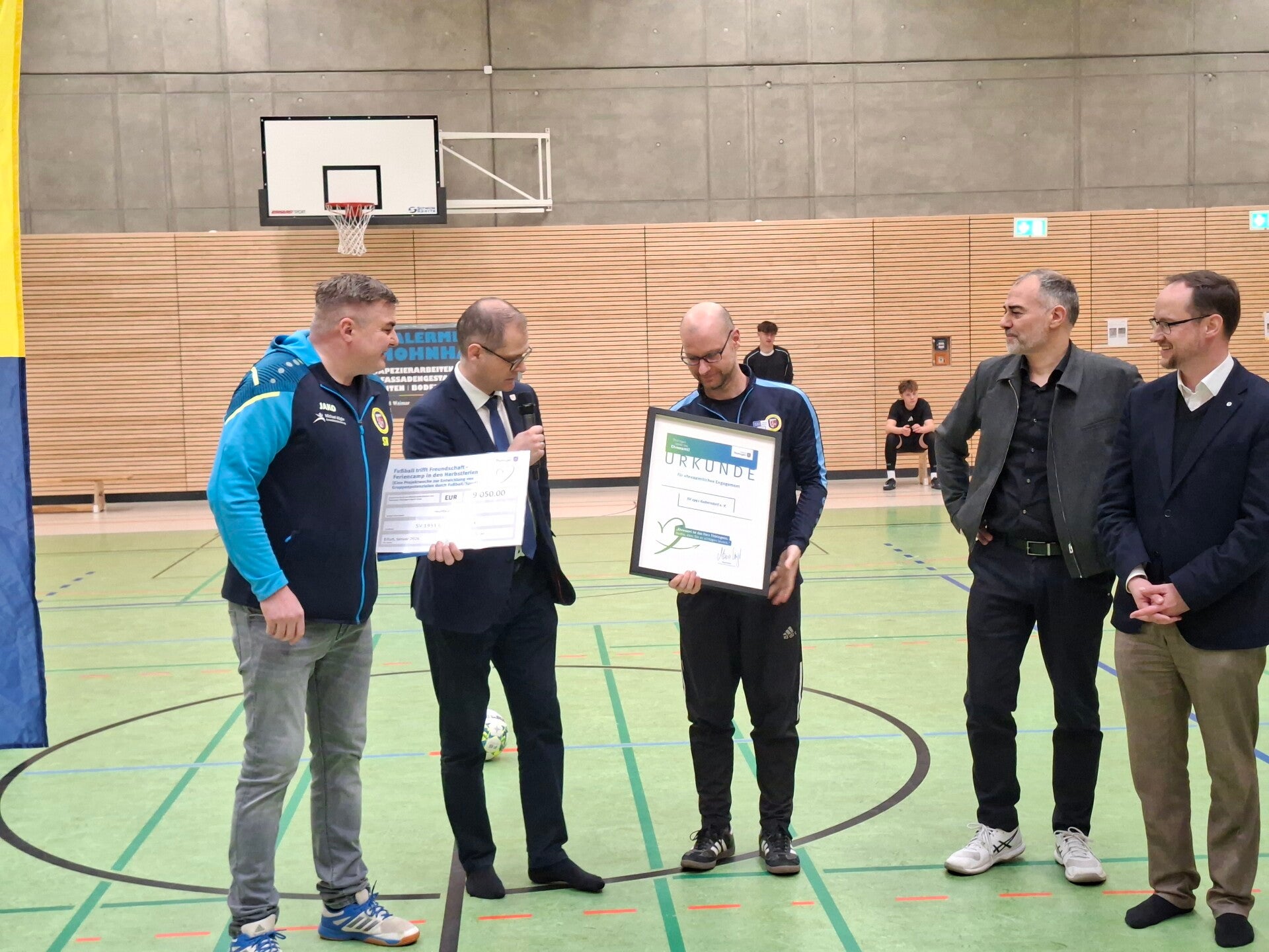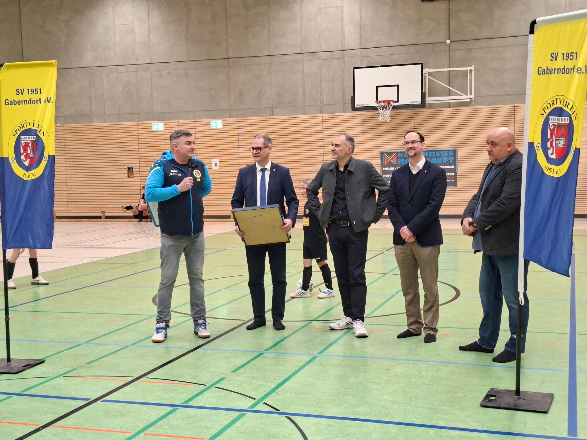 Den besonderen Moment der feierlichen Übergabe der Projekturkunde und eines Spendenschecks fanden Förderer und Verein während des vereinseigenen Futsalturniers am 31.01.26. Der Ehrenamtsbeauftragte der Thüringer Staatskanzlei, Herr Guntram Wothly und der Oberbürgermeister der Stadt Weimar, Herr Peter Kleine, fanden die richtigen Worte zum Ehrenamt und den Engagierten des Vereins. Herr Thomas Gottweiss, Landtagsabgeordneter, sowie der Ortsteilbürgermeister von Gaberndorf, Herr Thomas Steiner, beglückwünschten den Verein ebenso zu Ihrer herausragenden Nachwuchsarbeit. Somit wird das ehrenamtliche Engagement des Vereins öffentlich anerkannt und gewürdigt. Der Verein, der seine Nachwuchsarbeit in den vergangenen Jahren stark ausgebaut hat, verband im Camp sportliche Übungen mit Workshops, Teamspielen, einer Waldexpedition und dem Besuch im Hallenbad. Höhepunkte waren die Abnahme des DFB-Fußballabzeichens sowie eine Abschlussveranstaltung mit individueller Würdigung der Teilnehmenden und Trainer. Mit dem Projekt stärkte der SV 1951 Gaberndorf e.V. nicht nur den sportlichen Nachwuchs, sondern auch den gesellschaftlichen Zusammenhalt und die Ehrenamtskultur in der Region.