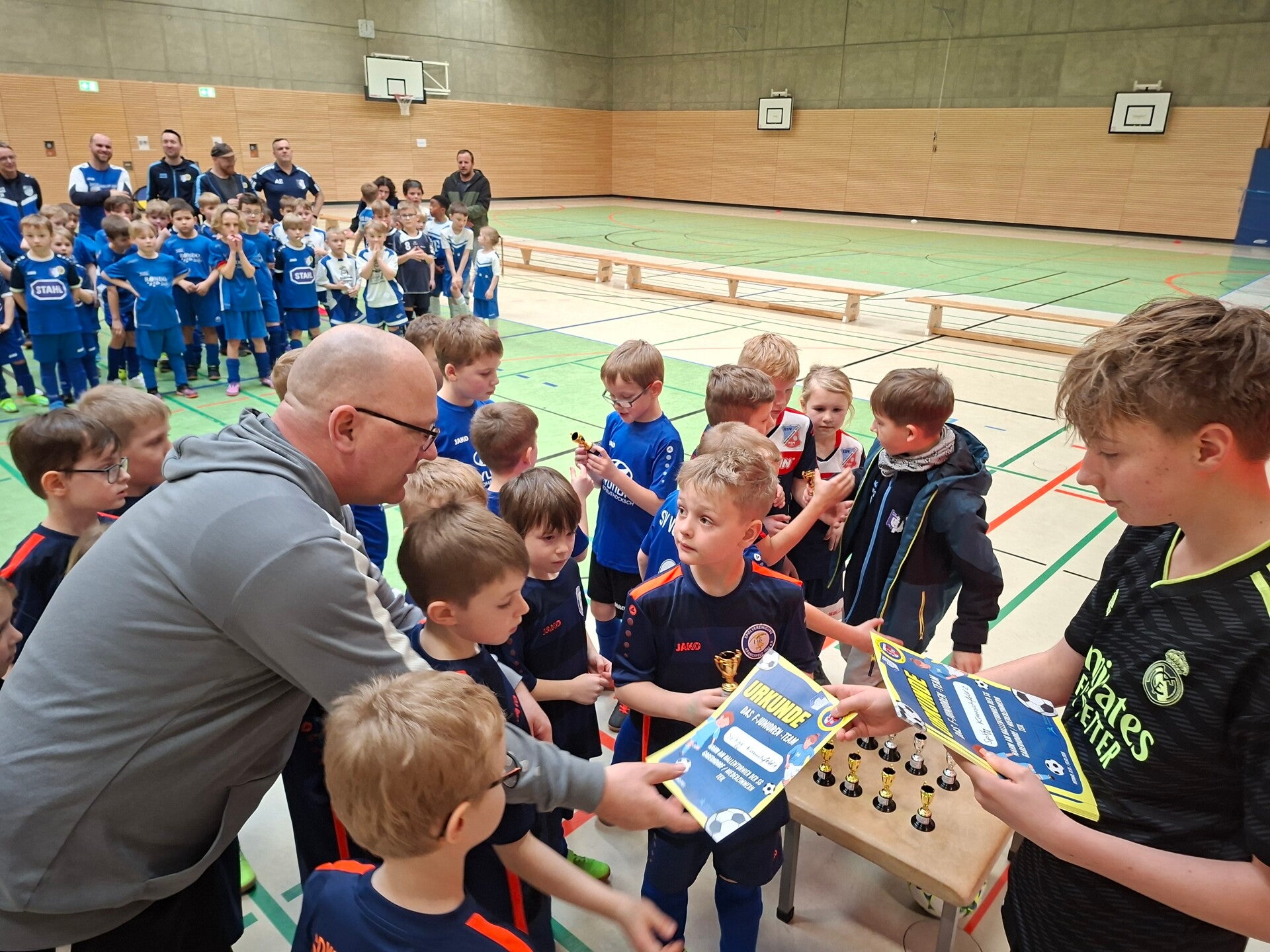 60 Kinder in 12 Teams, Spielformat Jeder gegen Jeden, 66 Spiele, 305 Tore. Das sind die Zahlen des Funino-Turniers des SV 1951 Gaberndorf am 01.02.2026. Jedes Team wurde am Ende für die tolle Teilnahme mit einer Urkunde und einem kleinen Pokal geehrt und somit die Leistungen der Kinder gewürdigt.